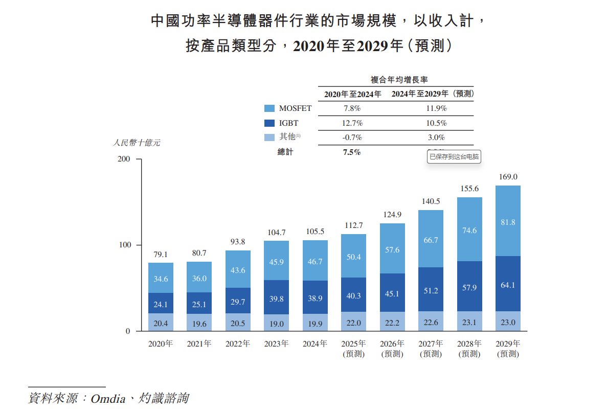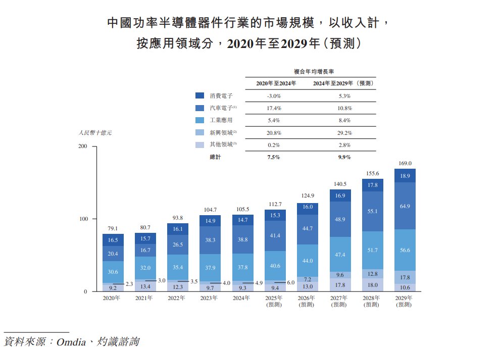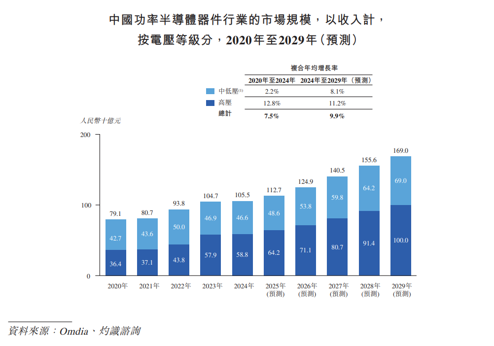中國(guó)功率半導(dǎo)體器件市場(chǎng)規(guī)模從2020年的人民幣791億元增長(zhǎng)至2024年的人民幣 1,055億元,期間復(fù)合年均增長(zhǎng)率為7.5%。在下游需求持續(xù)擴(kuò)張的推動(dòng)下,預(yù)計(jì)到2029 年,中國(guó)功率半導(dǎo)體器件市場(chǎng)規(guī)模將達(dá)到人民幣1,690億元,期間復(fù)合年均增長(zhǎng)率為 9.9%。