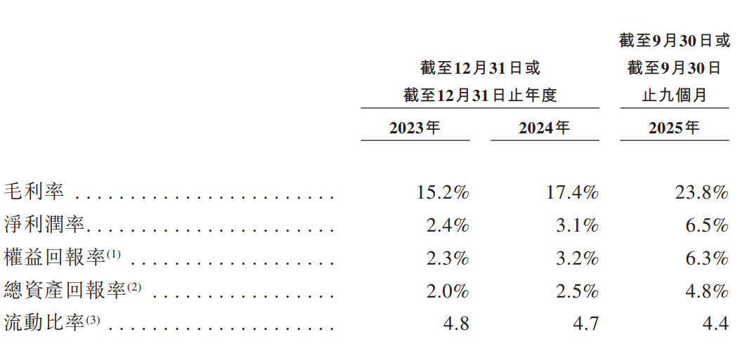 公司于2023年度、2024年度以及2025年截至9月30日止九個(gè)月,毛利率分別為15.2%、17.4%、23.8%。
