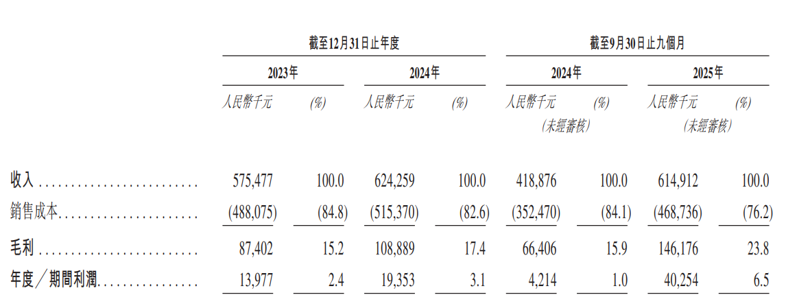 公司于2023年度、2024年度以及2025年截至9月30日止九個(gè)月,收入分別約為5.75億元、6.24億元、6.15億元人民幣。