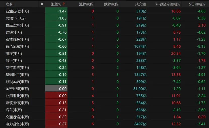 存量資金博弈明顯,石油石化、鋼鐵(850106)、有色、煤炭(850105)等資源股仍在回調(diào),近日抬頭的食品飲料板塊也回落,但跌幅較溫和。
