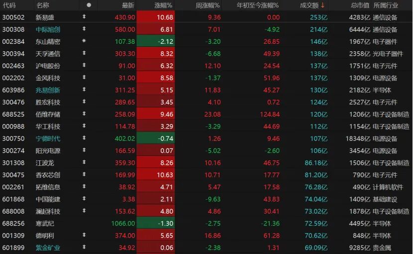 個(gè)股表現(xiàn)上,共計(jì)3554只個(gè)股收漲,70只漲停;1831只個(gè)股收跌,跌停股14只。活躍股以科技股為主,且收紅居多。CPO概念龍頭股“易中天”昨日大跌后,今日強(qiáng)勢(shì)反彈,新易盛(300502)收漲10.68%報(bào)430.9元/股,中際旭創(chuàng)(300308)收漲6.81%報(bào)580元/股,天孚通信(300394)收漲8.32%報(bào)303.3元/股。電源設(shè)備個(gè)股金風(fēng)科技(002202)漲近9%,電子設(shè)備制造個(gè)股佰維存儲(chǔ)(688525)、華工科技(000988)、江波龍(301308)、瀾起科技(688008)漲勢(shì)良好,電子元件(881270)個(gè)股滬電股份(002463)、勝宏科技(300476)、香農(nóng)芯創(chuàng)(300475)亦表現(xiàn)不俗。