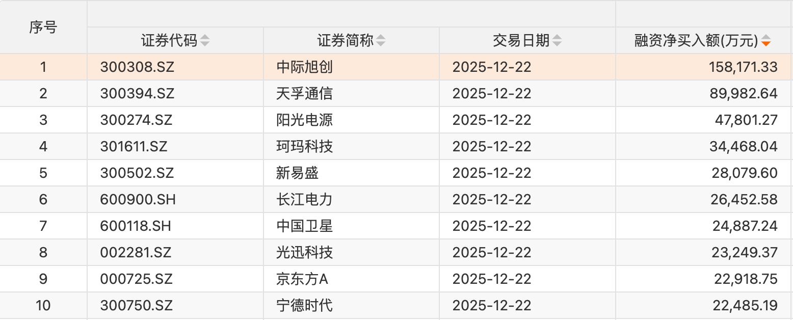 個(gè)股方面,32只個(gè)股獲融資凈買入額超1億元。中際旭創(chuàng)(300308)獲融資凈買入額居首,凈買入15.82億元;融資凈買入金額居前的還有天孚通信(300394)、陽光電源(300274)、珂瑪科技(301611)、新易盛(300502)、長(zhǎng)江電力(600900)、中國衛(wèi)星(600118)、光迅科技(002281)、京東方A、寧德時(shí)代(300750)等。